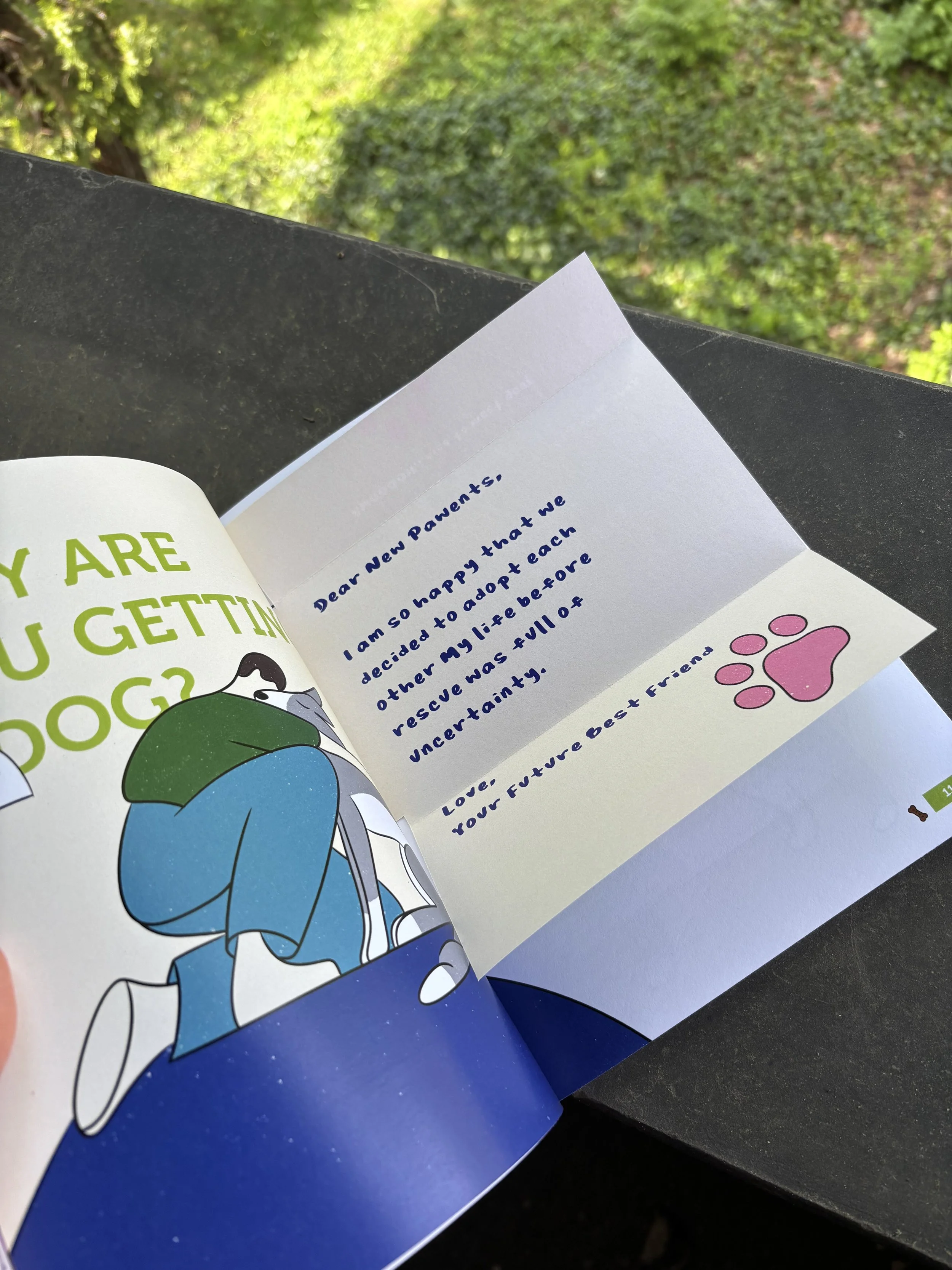 Letters from your future dog introduce each section, setting an empathetic tone and giving readers insight into what a dog may be feeling while navigating shelter life and the stress of major transitions. These letters invite readers to pause, interact, and reflect—creating small moments of discovery that deepen their emotional connection and understanding throughout the book.