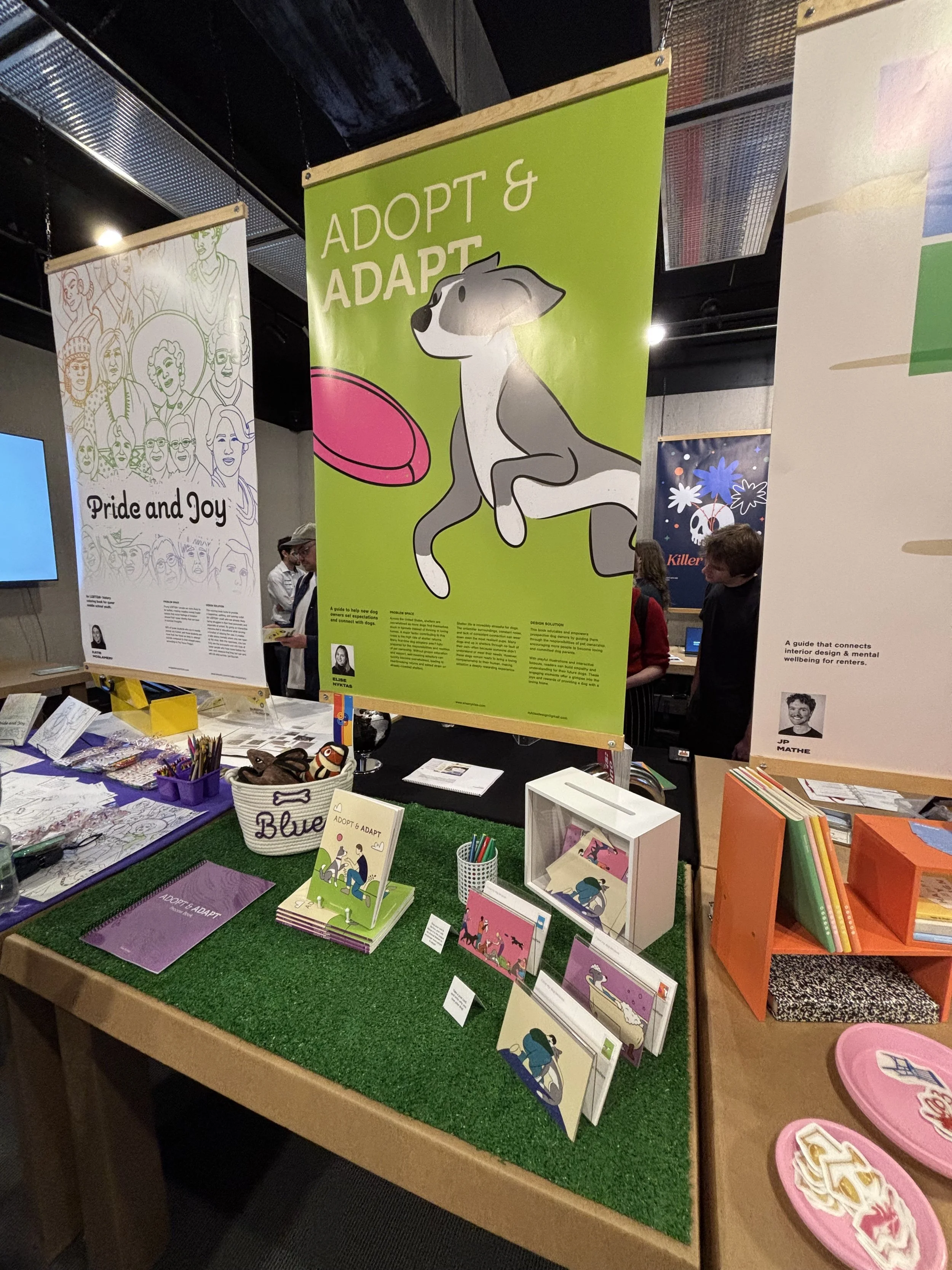 A large scale poster hangs above each table, designed to grab your attention and stand out from the rest. I used a dynamic image to pull people in and showcase my illustration style. The table was lined with turf, and centered was the final book copies. I also created postcards for people to write notes to their own dogs to give to the shelter after the event as a gift for their time in helping me with this project.
