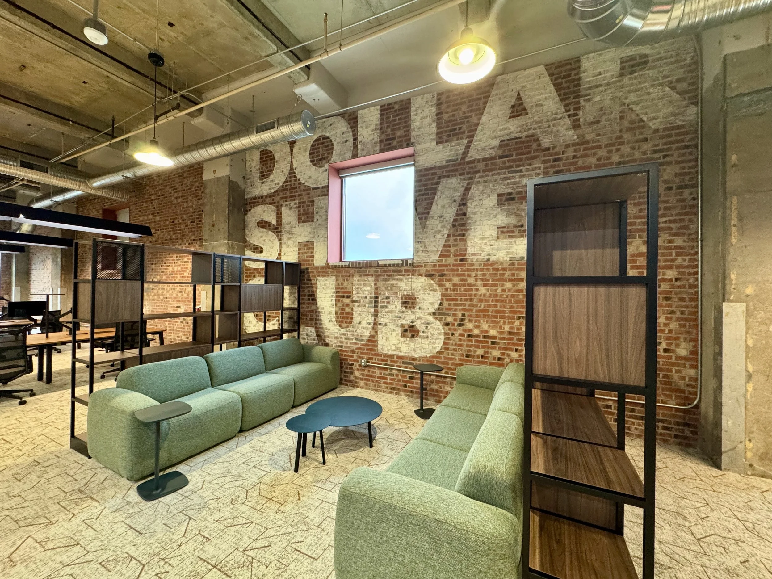 Metallic vinyl large scale razors shimmer over dark walnut banquette seating in the collaborative work space.