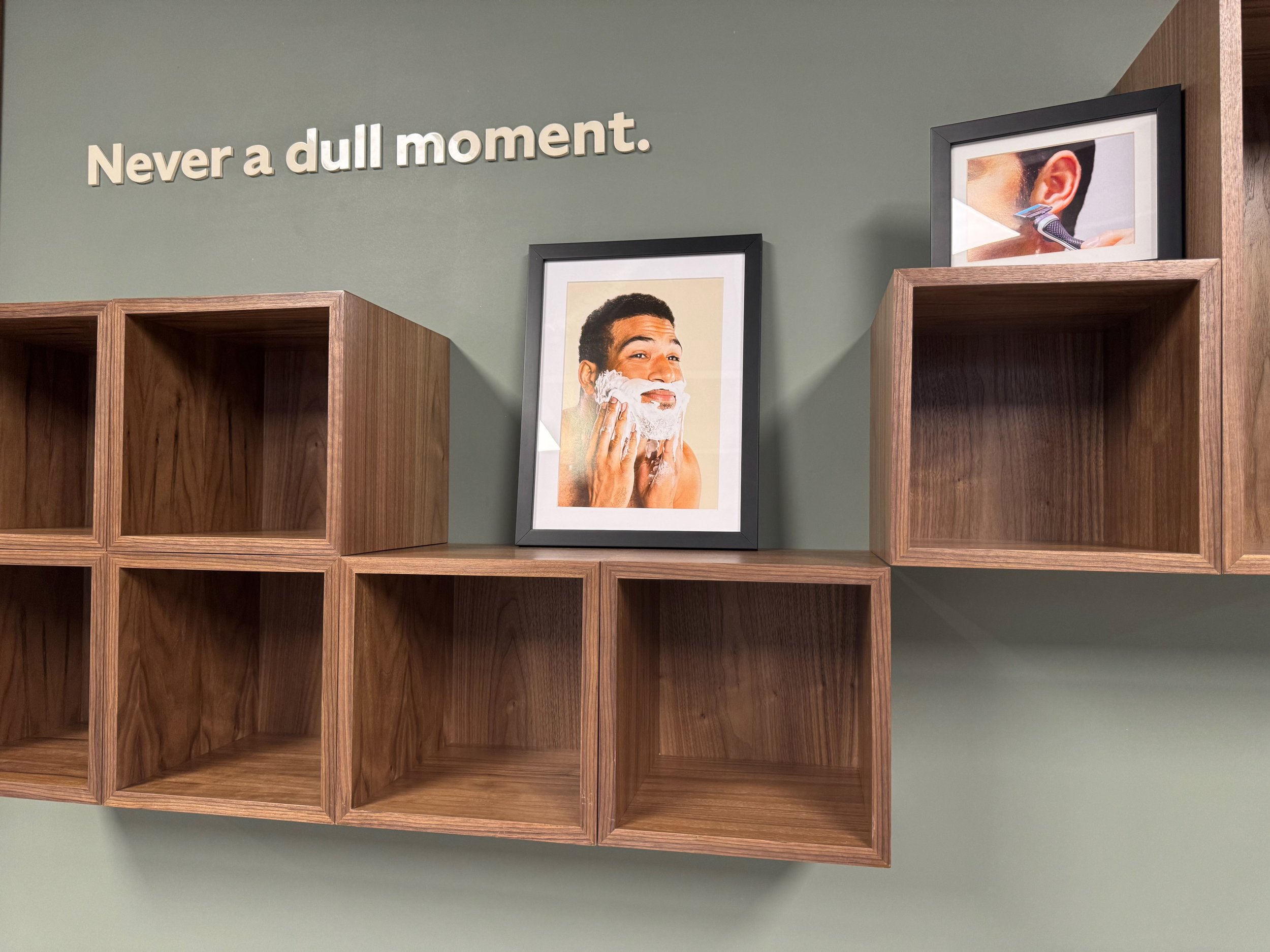 Dollar Shave Club’s iconic shaving cream caps are painted with the brands crest and mounted in the work lounge.