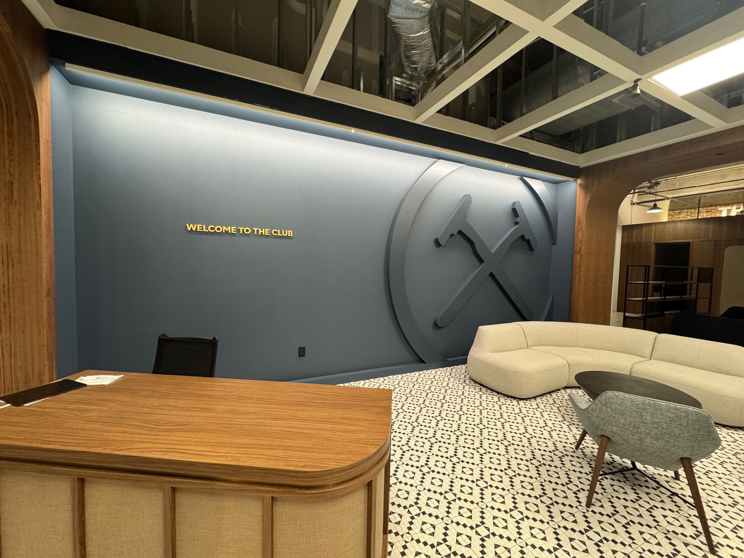 Pinmounted brass letters and an oversized logo welcome you to the space, setting the tone for your experience.